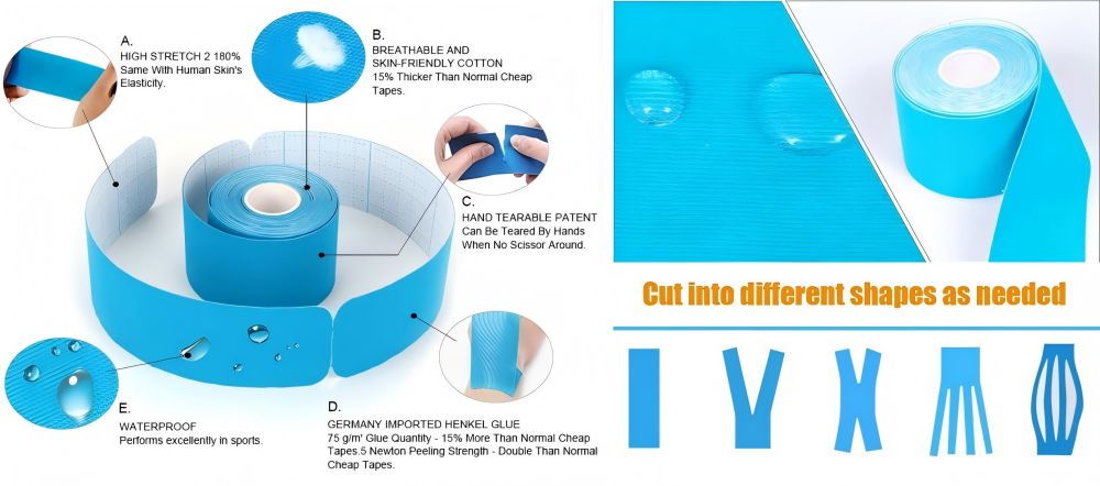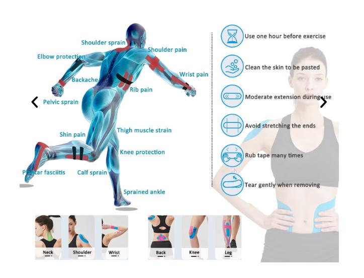 1.Camo Kinesiology Tape er vandtæt, elastisk, åndbar og hudvenlig. Det kan lindre hævelsesproblemer og hjælpe lymfatiske cirkulation; Det er velegnet til alle dele af kroppen, der gælder for sport, fysioterapi, vægttab og andre scenarier